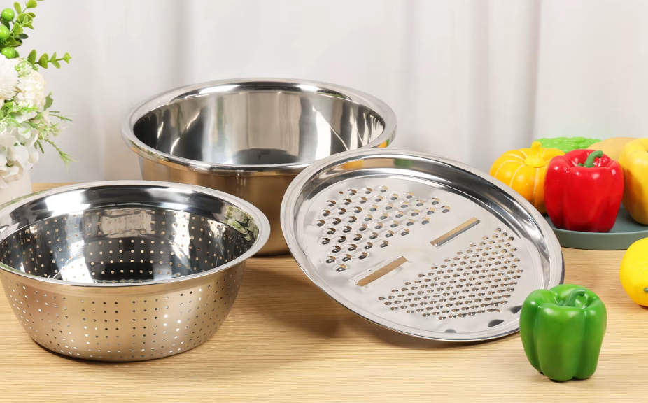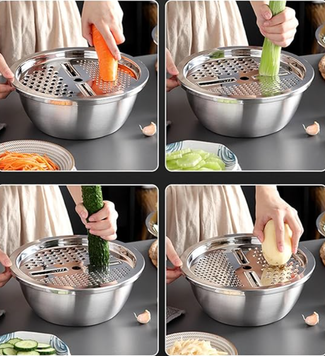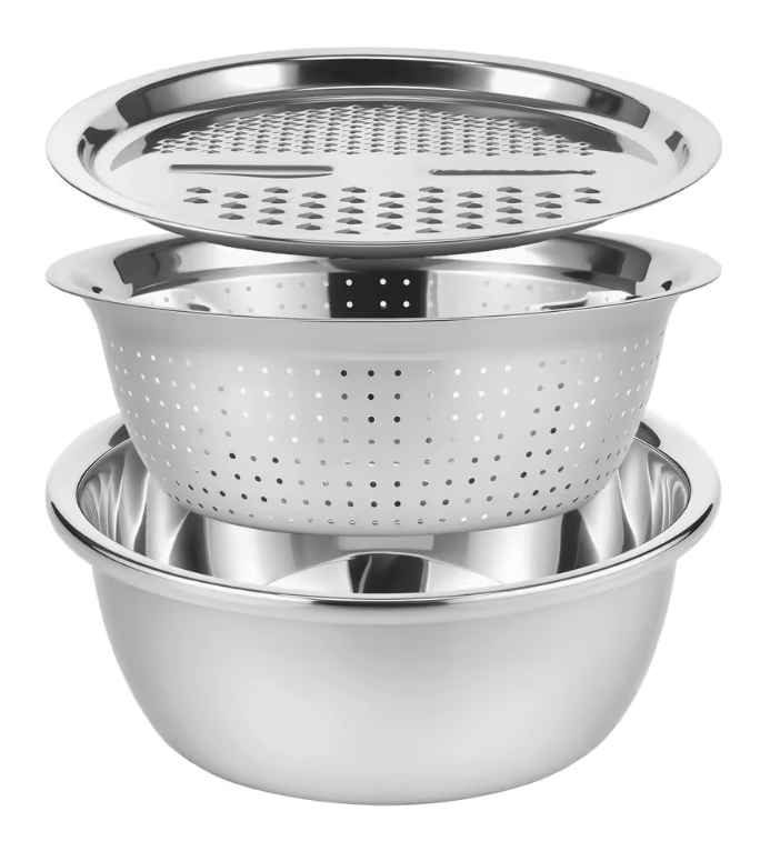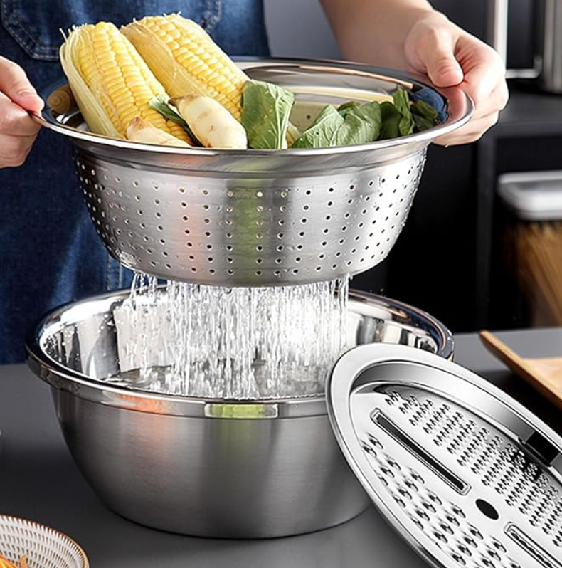 Ensemble de Bassins Multifonction 3 en 1 en Acier Inoxydable | Passoire, Bol & Râpe Empilables